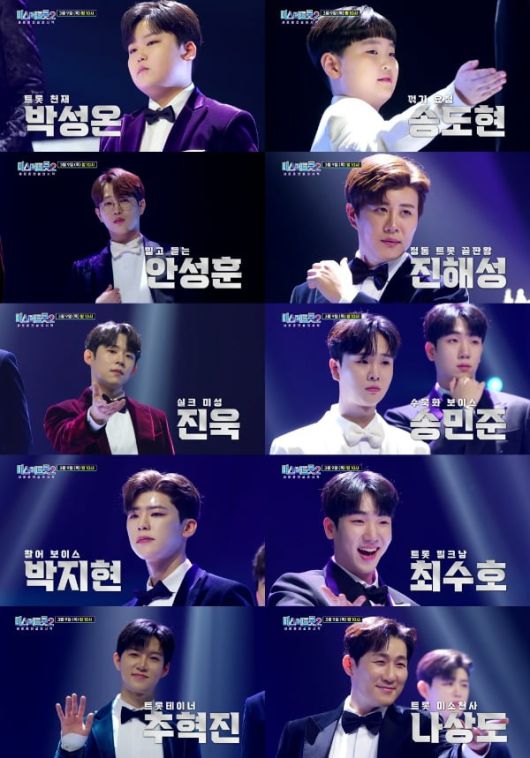 또, 촉촉함과 깊은 여운을 머금은 수묵화 보이스 6번 송민준, 속시원한 사이다 같은 팔딱팔딱 활어 보이스 7번 박지현, 풋풋한 비주얼에 걸쭉한 목소리 반전 매력의 트롯 밀크남 8번 최수호, 트롯이면 트롯 퍼포먼스면 퍼포먼스 미스터추 9번 추혁진, 코믹 캐릭터로 인기 급상승 미소 천사 0번 나상도까지, 상상 그 이상 초특급 무대로 팬심 사냥에 나설 예정이다.