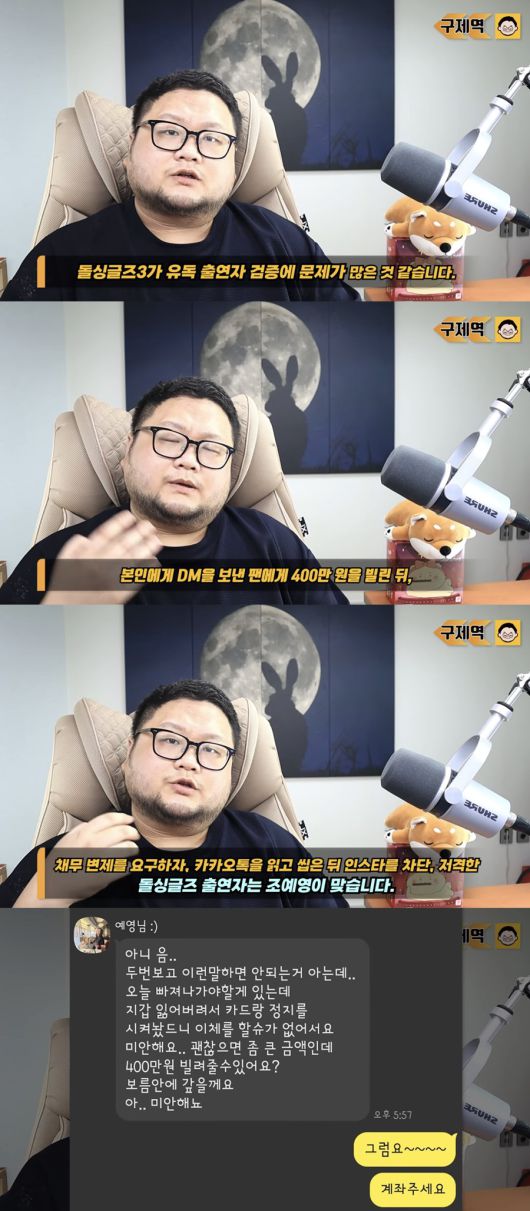 유튜버 '구제역'은 8일 '돌싱글즈3 출연자가 팬에게 400만 원 빌리고 잠수탄 이유'라는 제목의 영상을 올리고 조예영이 팬에게 400만 원을 빌리고 갚지 않았다는 채무 불이행 의혹을 제기했다.