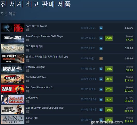 ▲ 3월 9일 오후 4시 기준 스팀 전세계 최고 판매 제품 TOP10 (자료출처: 스팀) |
