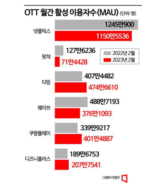 이와 반대로 웨이브 이용자수는 1년 만에 100만명 넘게 급감했다. 지난해 2월 488만7193명이었던 이용자수는 지난달 376만1093명을 기록했다. 토종 OTT 1위였던 웨이브는 지난해 9월 티빙에게 1위 자리를 내줬다.