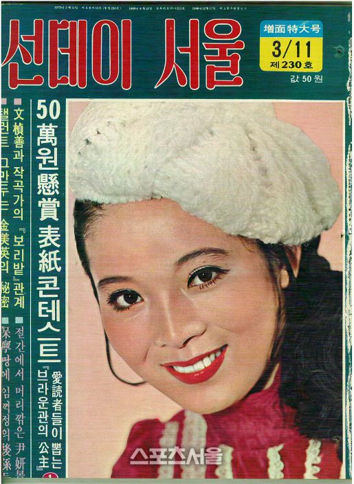 [스포츠서울] 지금으로부터 50년전인 1973년3월11일, 선데이서울 230호 표지 모델은 봄꽃처럼 화사한 스물셋 신인 탤런트 이효춘이었다.