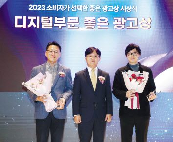 아시아나 항공 박수상(왼쪽부터) 아시아나항공 커뮤니케이션 담당, 홍경선 한국광고주협회 광고위원장, 유병욱 TBWA 코리아 크리에이티브 디렉터가 기념사진을 촬영하고 있다. [아시아나항공 제공] |