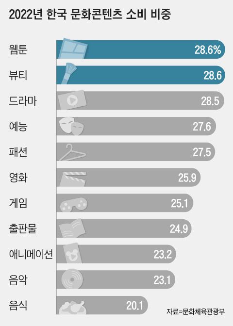 10일 문화체육관광부가 발표한 ‘2023 해외 한류 실태 조사’ 결과, 한류 콘텐츠 소비 비중 1위는 웹툰(28.6%)으로 조사됐다. 소비 비중은 항목별 소비 시간 및 지출액을 합산한 결과다. 이번 설문은 해외 26개국 2만5000명을 대상으로 지난해 11~12월 온라인 상에서 진행됐다.