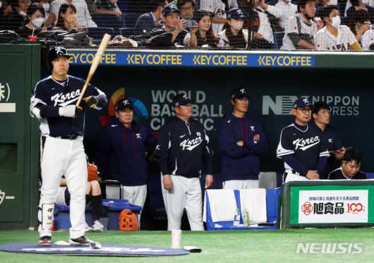 [도쿄=뉴시스] 김선웅 기자 = 10일 일본 도쿄돔에서 열린 월드 베이스볼 클래식(WBC) 2023 B조 일본과 대한민국의 경기, 이강철 감독과 선수들이 4:13으로 뒤지고 있는 상황, 덕아웃에서 심각한 표정으로 경기를 지켜보고 있다. 2023.03.10. mangusta@newsis.com |