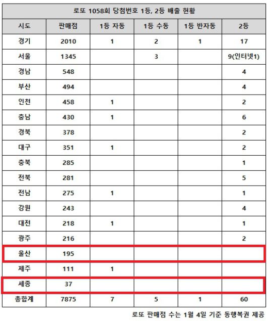 동행복권이 11일 추첨한 로또 1058회 당첨번호 조회 결과 1등은 13명, 2등은 60게임이다. 전국 17개 시도 중 세종 지역에서는 로또 고액(1,2등) 당첨 판매점이 울산, 세종에서는 단 한 곳도 나오지 않았다. |