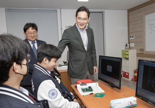 이재용 삼성전자 회장이 최근 스마트시티를 찾아 다양한 사회공헌활동을 하는 직원들과 만나 간담회를 가졌다. 이재용 회장이 지난 7일 구미전자공고를 방문, 학생들과 대화하는 모습. /삼성전자 |