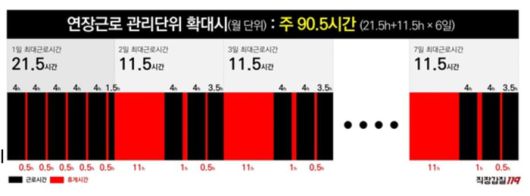 정부는 개편안에 따른 1주 최대 노동시간은 주휴일 1일을 제외하고 69시간(11.5시간×6일)이라고 가정하고 있지만, 주 90.5시간이 최대 노동시간이라는 지적도 나온다. 일반적 사례는 아니지만 이론적으로 가능하다는 것이다.