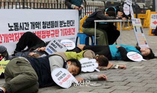 정부의 노동시간 개편안에 반대하는 민주노총 조합원들이 지난 9일 서울 용산구 전쟁기념관 앞에서 퍼포먼스를 하고 있다. 김창길 기자 |