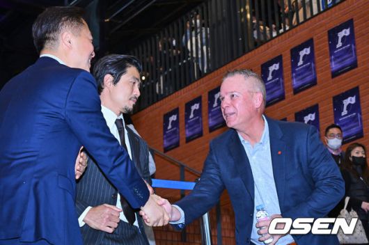 [OSEN=부산, 이석우 기자] 12일 롯데자이언츠가 2023시즌을 알리는 출정식과 함께 새로운 VI(Visual Identity)와 유니폼을 공개하는 쇼케이스 ‘1’을 12일 부산 수영구 민락동 밀락더마켓에서 열었다. 롯데 자이언츠 서튼 감독이 이강훈 대표, 성민규 단장과 인사를 하고 있다. 2023.03.12 / foto0307@osen.co.kr