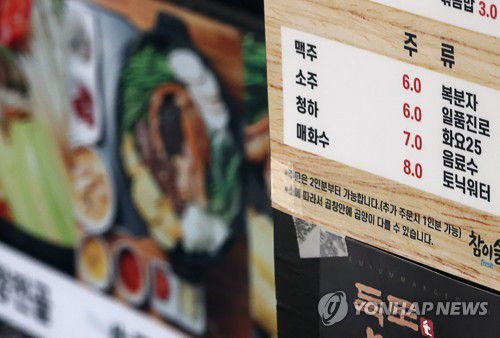 (세종=연합뉴스) 곽민서 박원희 기자 = 지난달 식당에서 파는 맥주·소주·막걸리 등 주류 물가 상승률이 마트 등에서 파는 주류의 상승률보다 높은 것으로 나타났다.