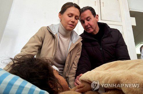 지진 피해 아동 살펴보는 바샤르 알 아사드와 그의 아내 |