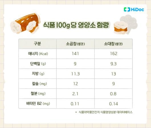 곱창은 소의 소장, 대창은 소의 대장 부위를 말한다. 내장은 콜라겐과 엘라스틴과 같은 섬유가 많은 근육으로 되어있어 단백질이 많은 식품이다. 소의 곱창 100g은 열량 140kcal, 단백질 9g, 지방 11.3g을 가지며, 소의 대창 100g은 열량 160kcal, 단백질 9.3g, 지방 13g을 가진다. 소의 살코기 부위인 안심 100g에 26g의 단백질이 들어있는 것과 비교하면, 살코기의 30% 정도의 단백질을 가진다. 2020 한국인 영양소 섭취기준에 따르면, 성인 남녀의 하루 단백질 권장 섭취량은 55~65g이다. 곱창이나 대창 1인분(200g)에는 하루 단백질 권장량의 20% 정도 섭취가 들어있는 셈이다.