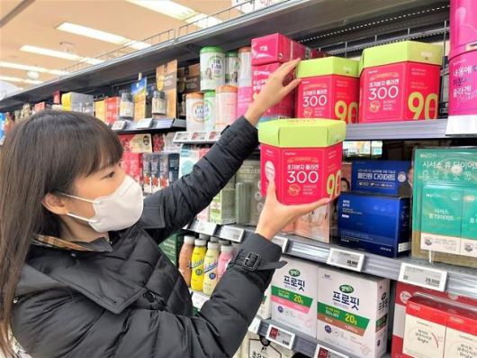 롯데마트 서울역점 건강기능식품 매장에서 '초저분자 콜라겐 300'을 구매하고있는 고객 모습