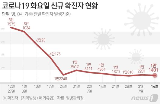 (서울=뉴스1) 김지영 디자이너 = 질병관리청 중앙방역대책본부(방대본)는 14일 0시 기준 신종 코로나바이러스 감염증(코로나19) 신규 확진자가 1만1401명 발생했다고 밝혔다.jjjioe@news1.krCopyright ⓒ 뉴스1. All rights reserved. 무단 전재 및 재배포 금지.