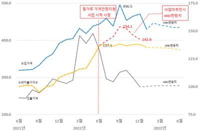제분용 밀 수입단가와 밀가루 소비자물가지수 추이. |