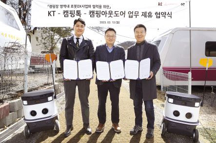 KT는 캠핑톡, 캠핑아웃도어와 함께 서울 북한산 글램핑장에서 실외자율주행로봇 사업 확산을 위한 업무협약(MOU)을 체결했다고 14일 밝혔다.