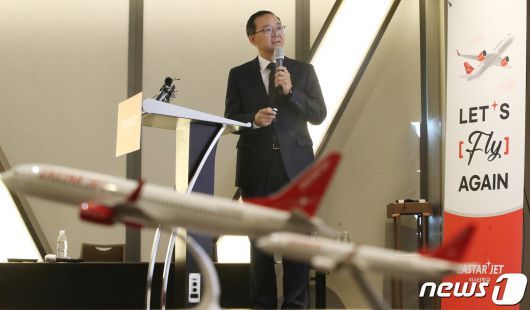 (서울=뉴스1) 임세영 기자 = 조중석 이스타항공 대표이사가 14일 오전 서울 강서구 코트야드 바이메리어트 서울 보타닉파크 호텔에서 열린 이스타항공 재운항 기념 기자간담회에서 발언을 하고 있다. 이스타항공은 이달 26일부터 김포-제주 노선을 시작으로 운항을 재개한다. 2023.3.14/뉴스1