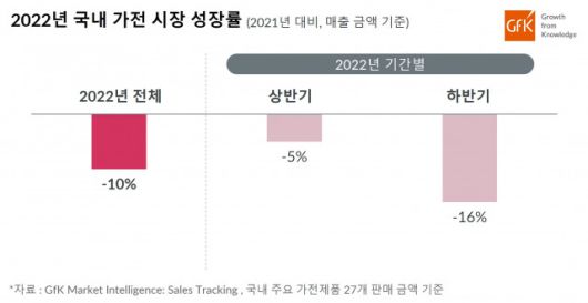 글로벌 마켓 인텔리전스 기업 GfK에 따르면 코로나 기간 큰 성장세를 보였던 가전 시장은 2021년에 정점을 찍고 2022년 10% 하락한 것으로 분석됐다. 이는 국내의 대표 가전제품 27개를 기준으로 분석한 것으로, 주요 오프라인과 온라인 채널을 포함한 수치다(매출 금액 기준).