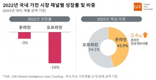 가전 시장의 전반적인 하락은 꾸준히 성장해 오던 온라인 채널(오픈 마켓, 소셜 커머스, 종합몰, TV홈쇼핑)의 성장률마저 떨어뜨렸다. 2022년 온라인 채널 성장률(2021년 대비, 매출 금액 기준)은 -3%, 오프라인(가전 전문점, 대형 마트, 백화점)에서의 판매 성장률은 -16%를 기록하며 동반 하락했다.