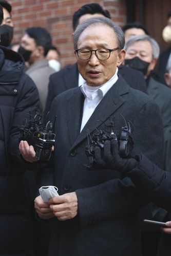 윤석열 대통령의 신년 특별사면으로 사면·복권된 이명박 전 대통령이 2022년 12월30일 오후 서울 강남구 논현동 자택에 도착해 대국민 메시지를 발표하고 있다. 연합뉴스 |