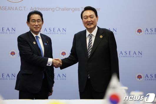 윤석열 대통령이 13일(현지시간) 캄보디아 프놈펜의 한 호텔에서 열린 한일 정상회담에서 기시다 후미오 일본 총리와 악수하고 있다. (대통령실 제공) 2022.11.14/뉴스1 ⓒ News1 오대일 기자 |