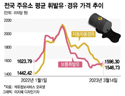 석유정보서비스 오피넷에 따르면 이날 리터당 전국주유소 평균 휘발유 가격은 1596.30원, 경유 가격은 1546.73원이다. 유류세 인하폭 조정을 고려하더라도 지난해 같은 기간(3월 15일 휘발유 2000.95원·경유 1912.14원) 대비 크게 안정된 수준이다. 특히 러시아-우크라이나 전쟁 이후 확대된 에너지 수급난이 가라앉으며 경유 가격이 안정세를 보이고 있다.