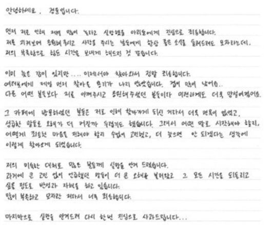 경윤은 지난 14일 팬카페에 직접 쓴 편지를 올렸다. "저로 인해 제일 놀라고 실망했을 아리들(팬덤)에게 진심으로 미안하다. 내 부족함으로 힘든 시간을 보내게 했다"고 말문을 열었다.