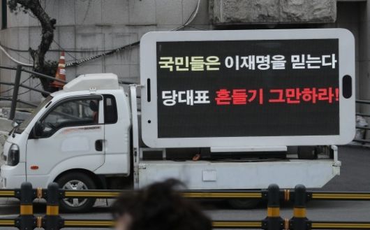 이들은 전광판에 ‘국민은 이재명을 믿는다. 당 대표 흔들기 그만하라’ ‘77.7% 당원의 뜻 거스르지 말라’ 등의 문구를 넣었다.