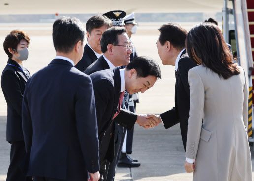 1박2일 일정으로 일본을 방문하는 윤석열 대통령이 16일 오전 성남 서울공항에서 공군1호기 탑승에 앞서 국민의힘 김기현 대표, 주호영 원내대표와 차례로 인사하고 있다.(사진=연합뉴스) |