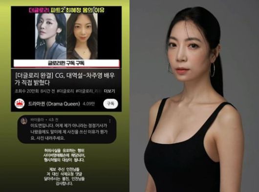 또 자신을 차주영 몸매 대역이라고 소개한 유튜브 캡처를 올리고 "내가 아니라는 정정기사가 나왔음에도 내 사진을 쓴 이유가 뭐냐"고 지적하며 "허위사실을 유포하는 행위는 사이버명예훼손에 해당되어 형사 처벌의 대상이 된다"고 경고했다.