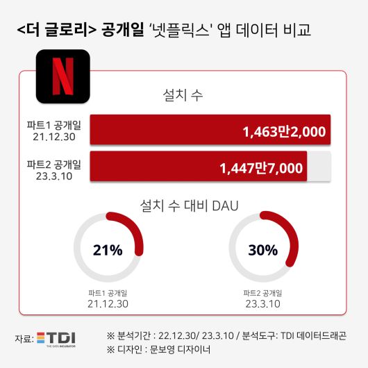 빅데이터 전문기업 TDI(티디아이, 대표 신성균)가 자사의 플랫폼 데이터드래곤을 통해 안드로이드 사용자가 설치한 ‘넷플릭스’ 앱의 빅데이터를 분석했다. 분석 기간은 <더 글로리> 파트 1·2 공개일인 22년 12월 30일과 23년 3월 10일이다.