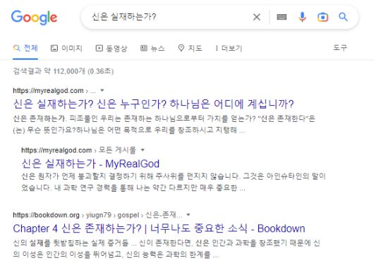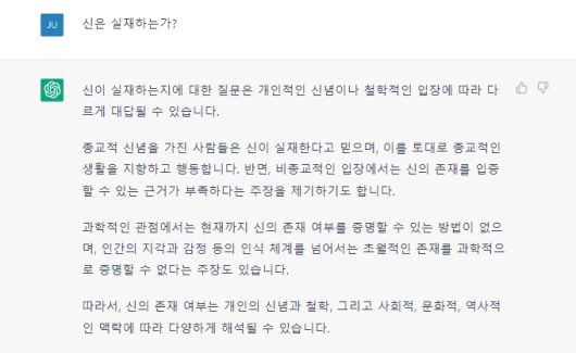 ‘신은 존재하는가?’라는 철학적인 질문에 ChatGPT는 ‘신념이나 입장에 따라 다르다’라며 다양한 관점과 주장을 제시했다. 반면에 구글 검색은 단순하게 종교단체의 광고 혹은 콘텐츠만 보여줬다.