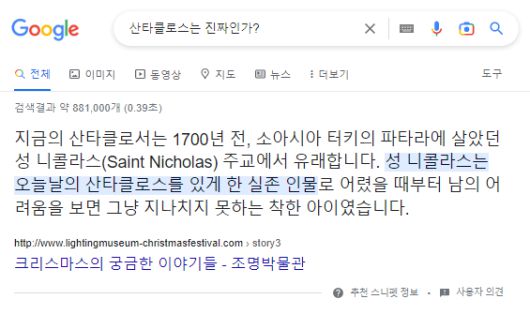 이 질문에 ChatGPT는 ‘실제로 존재하지 않는 인물’이라고 답한 반면, 구글 검색은 실존 인물이라고 답했다. 물론 정확하게 말하자면, 구글 검색에서도 ‘성 니콜라스는 오늘날의 산타클로스를 있게 한 실존 인물’이라고 밝히고 있긴 하지만 질문에 더 정확한 답변을 한 것은 ChatGPT였다.