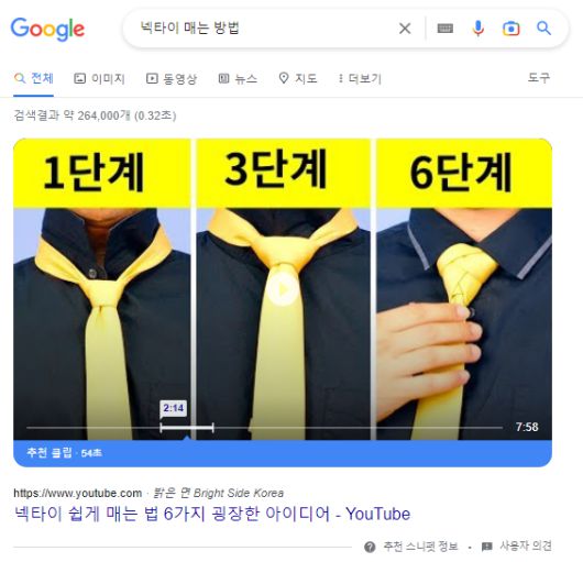구글 검색 엔진은 ‘넥타이 매는 법’을 질문했을 때 텍스트보다 더 유용한 영상 정보를 제공했다. ChatGPT-4 역시 텍스트 설명만 제공하지만, 이전 버전이 기본적인 방법만 알려줬다면 최신 버전은 윈저 넥타이 매는 방법까지 소개하는 등 더 상세한 정보를 전달했다.