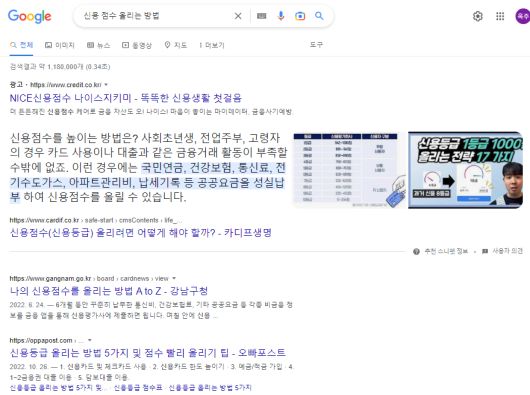 ChatGPT는 신용 점수를 올리는 빠른 방법은 없다며, 소개한 방법들을 꾸준히 실천하면서 관리하는 것이 중요하다고 조언했다. 반면에 구글 검색은 신용 관련 업체 광고와 더불어 신용 점수를 ‘빠르게’ 올릴 수 있다는 콘텐츠를 제시했다.