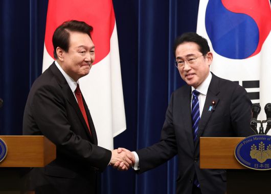 윤석열 대통령(왼쪽)과 기시다 후미오 일본 총리가 16일 도쿄 총리 관저에서 열린 한·일 정상 공동 기자회견을 마친 뒤 악수하고 있다. 도쿄=뉴시스 |