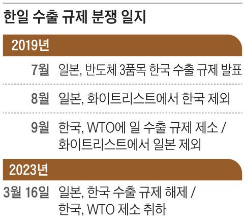 일본이 16일 한국에 대한 반도체 핵심 소재 3개 품목의 수출 규제를 해제하기로 했다. 동시에 우리 정부도 일본의 수출 규제에 대한 세계무역기구(WTO) 제소를 취하하기로 했다. 2018년 한국 대법원의 징용 배상 판결과 일본의 보복 조치로 악화일로이던 한일 경제 협력 관계가 정상화의 시동을 걸었다. 양국은 수출 절차 간소화 혜택을 주는 화이트리스트(수출 심사 우대국)에 상대방을 다시 포함하는 조치에 대해서도 긴밀히 논의할 예정이다.
