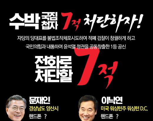 수박 7적 포스터에는 문 전 대통령과 이낙연 전 대표를 비롯해 강병원·김종민·윤영찬·이상민·이원욱 의원의 얼굴과 지역구, 휴대전화, 업무용 번호 등이 적혔다. 포스터는 명단에 오른 정치인들을 "자당의 당 대표를 불법 조작체포 시도하여 적폐 검찰이 창궐하게 하고 국민의힘과 내통해 윤석열 정권을 공동 창출한 1등 공신"이라고 했다.