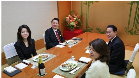 연합뉴스에 따르면 윤 대통령과 부인 김건희 여사(사진 맨 왼쪽)는 이날 저녁 7시 40분께 스키야키로 유명한 요시자와(吉澤) 식당에 도착했다고 대통령실 이도운 대변인이 서면 브리핑을 통해 전했다.