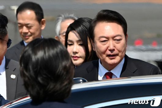 한일 정상회담 첫째 날인 16일 윤석열 대통령과 부인 김건희 여사가 일본 도쿄 국제공항에 착륙한 대통령 전용기에서 내린 뒤 의전 차량에 탑승하고 있다. 2023.03.16. ⓒ AFP=뉴스1 ⓒ News1 김성식 기자 |