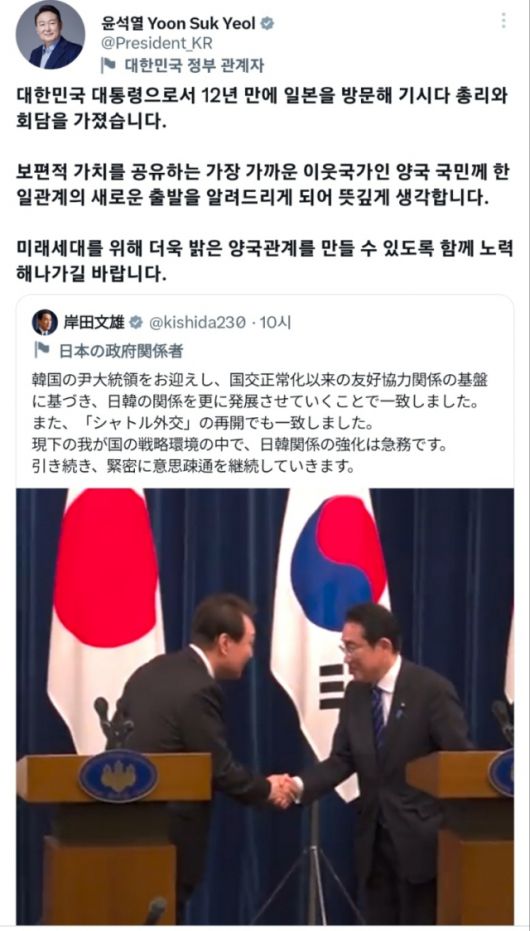 윤 대통령이 공유한 기시다 총리의 글은 전날 자정께 작성된 게시물이었다. 기시다 총리가 윤 대통령과 두 차례 연속 만찬을 가진 뒤 돌아가 작성한 것으로 보인다. 기시다 총리는 자신의 트위터 계정에 “한국의 윤 대통령과 함께 한일관계를 더욱 발전시키기로 했다. ‘셔틀외교’를 재개하자는 데도 의견이 일치했다”며 “현재 전략환경 속에서 한일관계 강화는 급선무”라는 내용의 글과 함께 한일정상회담을 보도한 영상을 올렸다.