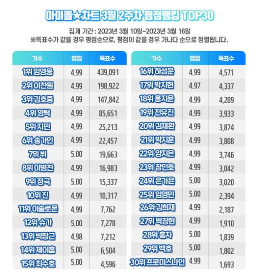 가수 임영웅이 3월 2주차 아이돌차트 평점랭킹에서 최다득표자에 올랐다.