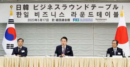 윤 대통령은 오후 12시 일본 도쿄 게이단렌 회관에서 개최된 ‘한일 비즈니스 라운드테이블’에 참석해 양국 간 미래지향적 경제협력 비전에 대해 논의했다. 우리 대통령이 한일 경제인 행사에 참석한 것은 2009년 6월 이명박 대통령 방일 기간에 개최된 ‘한일 경제인 간담회’ 이후 14년 만이다. 윤 대통령은 이 자리에서 "한일이 경제교류 하는 데 만약에 걸림돌이 있고, 그게 정부가 제거할 수 있는 것이면 기꺼이 제거하고 지원해 주겠다"는 취지로 말했다. 양국 경제계는 이날 반도체, 배터리 등 첨단 산업의 공급망 안정과 첨단·과학기술 협력, 디지털 전환 등 미래를 준비하는 작업을 함께 하기로 했다.