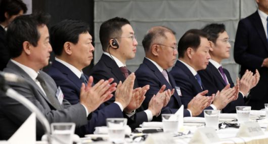 이번 한일 비즈니스 라운드 테이블에는 이 회장을 비롯해 최태원 SK그룹 회장, 정의선 현대자동차그룹 회장, 구광모 LG(003550)그룹 회장, 신동빈 롯데그룹 회장 등 한국 기업과 기업단체 대표 12명이 앉았다. 전경련 회장단에 속한 김윤 삼양홀딩스(000070) 회장, 이웅열 코오롱(002020) 명예회장, 류진 풍산(103140) 회장, 조현준 효성(004800) 회장 등도 이름을 올렸다.