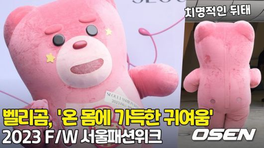 [OSEN=최재현 기자]17일 서울 중구 동대문디자인플라자(DDP)에서 2023 F/W 서울패션위크 '홀리넘버세븐' 컬렉션 포토콜 행사가 열렸다. 캐릭터 벨리곰이 입장하며 포즈를 취하고 있다. 2023.03.17 / hyun309@osen.co.kr [사진] 영상캡처