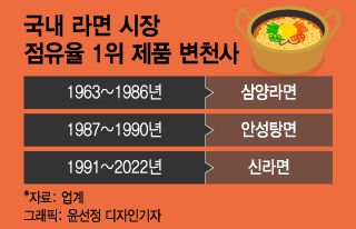 1963년 국내 최초로 출시된 삼양라면은 1986년까지 20년 넘게 부동의 1위였다. 후발 주자인 농심은 1983년 출시한 안성탕면으로 추격에 나섰다. 안성탕면은 출시 4년 만인 1987년 처음으로 판매량 1위로 올라섰지만 오래 가지 못했다. 1991년 매운맛 인기에 힘입은 신라면에 1위 바통을 넘겨줬다. 신라면은 지난해까지 32년째 1등 라면을 지키고 있다.