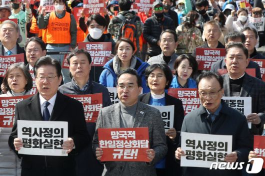 (서울=뉴스1) 민경석 기자 = 이재명 더불어민주당 대표(왼쪽부터)와 박홍근 원내대표, 이해찬 상임고문이 18일 오후 서울 중구 서울광장에서 열린 '대일 굴욕외교 규탄 범국민대회'에 참석해 구호를 외치고 있다. 2023.3.18/뉴스1  Copyright (C) 뉴스1. All rights reserved. 무단 전재 및 재배포 금지.