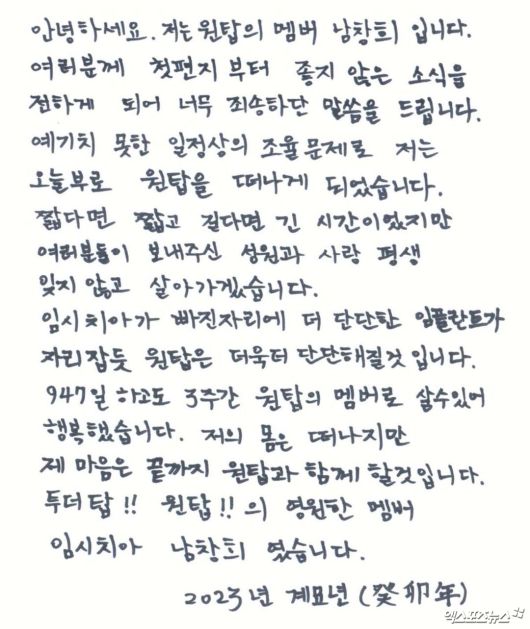 남창희는 "좋지 않은 소식을 전하게 되어 너무 죄송하단 말씀을 드립니다"라고 사과했다. 이어 그는 "짧다면 짧고 길다면 긴 시간이었지만 여러분들이 보내주신 성원과 사랑 평생 잊지 않고 살아가겠습니다"라며 감사를 표했다.