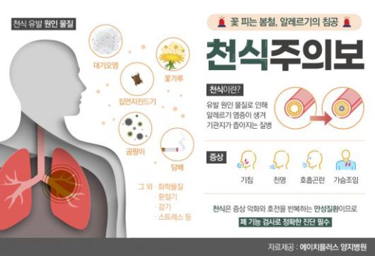 천식은 폐로 연결되는 통로인 기관지에 알레르기 염증이 발생하는 질병으로 특정 유발 원인 물질에 염증이 생기면서 기관지가 심하게 좁아지는 현상이다. 증상은 기침과 호흡 할 때 쌕쌕거리는 소리가 나는 천명, 호흡곤란, 가슴을 죄는 답답함이 생기며, 새벽에 증상이 심해질 수 있다. 천식의 환경적 원인은 환절기와 대기오염, 꽃가루와 집먼지진드기, 곰팡이 등 다양하다.