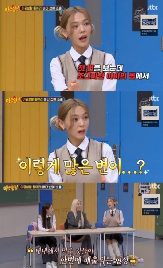 선예는 "정말 신기한 경험도 했다. 아이를 낳고 첫 변을 보고 깜짝 놀란 게 저 작은 몸에서 어쩜 이렇게 많은 변이 나오나 싶더라. 미드 와이프에게 물어보니 태내에서 먹은 것들이 한 번에 배출되는 현상이라고 했다. 태변이었던 거다"라며 놀라운 일화를 설명했다.